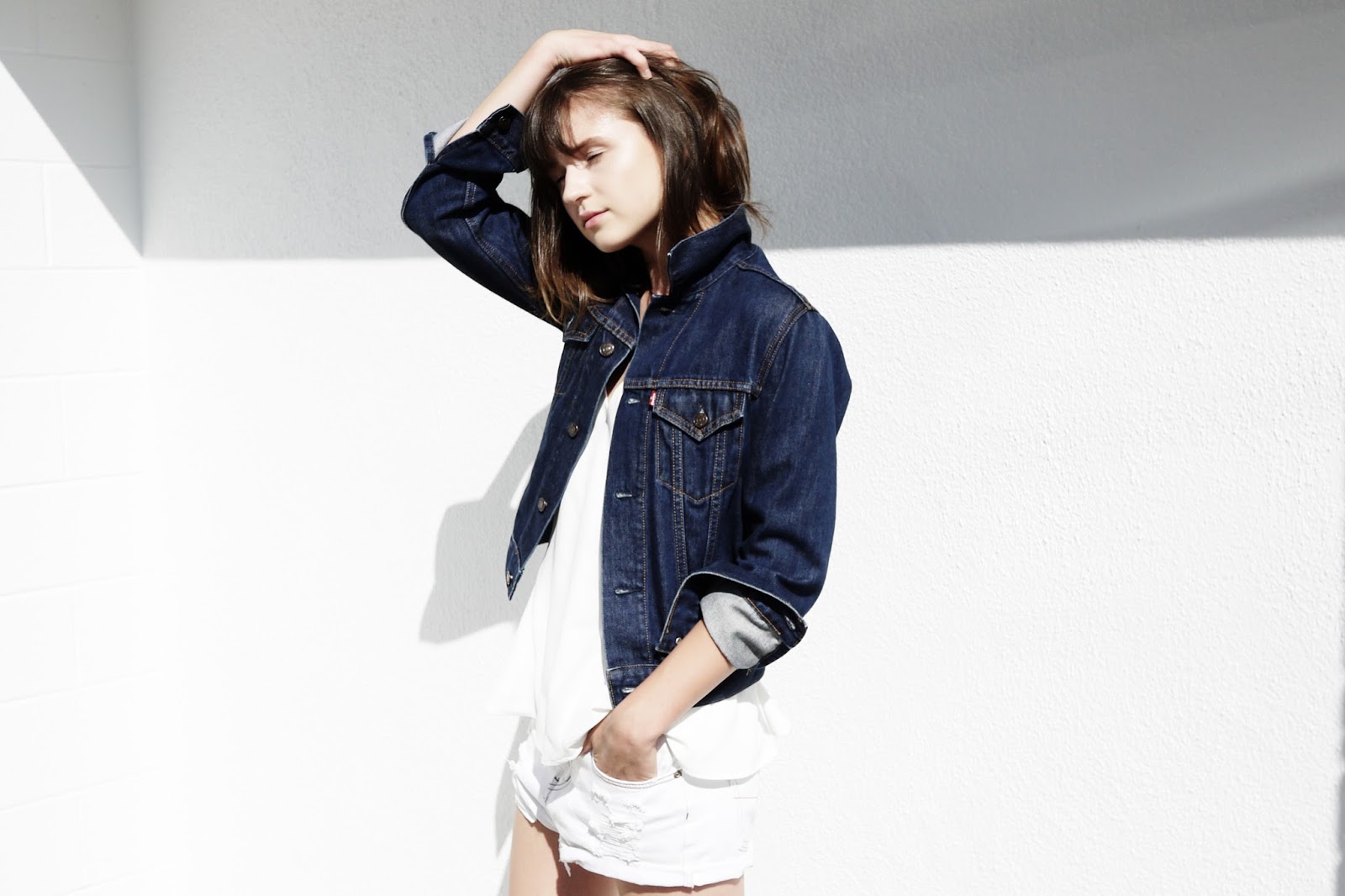 August. When it's too hot outside for anything but barely there camis but then you're left freezing while waiting for your venti iced (dirty) chai tea latte. I've gotten into the habit of always having a jacket option with me after one too many brunch adventures turned into freeze-your-a**-off, late night outings. Here I paired an amazing Finders Keepers cami with white baggy shorts. Super easy, looks hella cool girl and might actually keep you from breaking a sweat. Threw on my trusty denim jacket as a layering option and comfy new balance sneakers to keep it casual. This is LA after all.